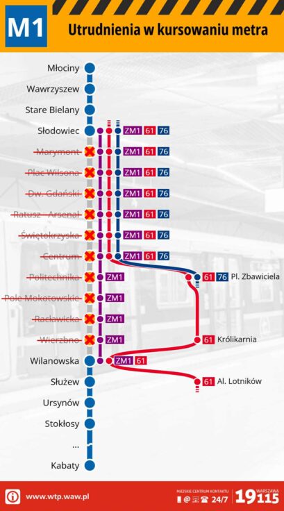 🚇Warszawskie metro lini M1 zostaje wyłączone z ruchu na centralnym odcinku. Pociągi nie będą kursować na odcinku WILANOWSKA – SŁODOWIEC. Zalecamy z wyprzedzeniem sprawdzenie informacji podanych przez Warszawski Transport Publiczny.