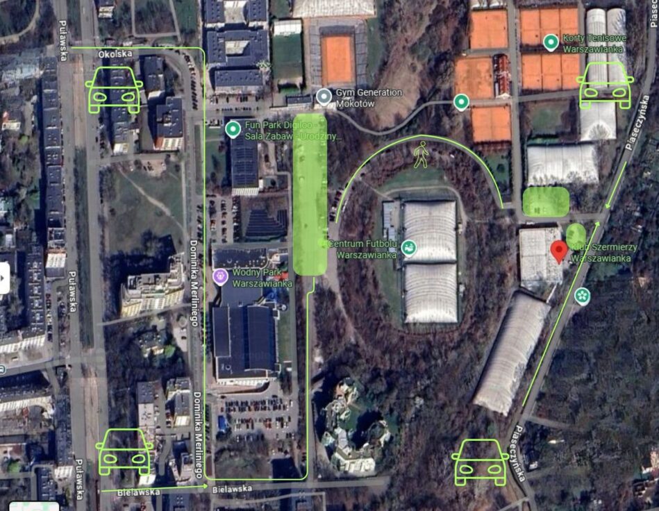 Ze względu na duże obłożenie obiektu w dniu zawodów zachęcamy do skorzystania z górnych parkingów i dojścia na salę (patrz strefy zaznaczone na zielono)